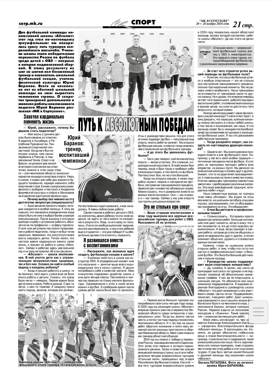 Тренер и футбольная команда школы «Абсолют» в центре внимания прессы